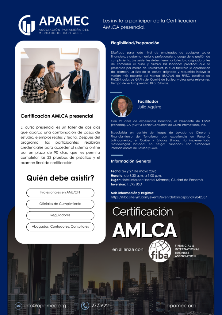 Julio Aguirre – Con 27 años de experiencia bancaria, el Sr. Julio Aguirre se desempeña como Presidente de CSMB (Panama), S.A. y como SVP y Senior Consultant de CSMB International, Inc. La trayectoria profesional del señor Aguirre incluye el haberse desempeño por más de 11 años como SVP – Head of Compliance del Banco Latinoamericano de Comercio Exterior, S.A. y por más de 16 años en Banco Internacional de Panama como Gerente Financiero, SVP de Compliance y VP de Operaciones. Nuestro instructor cuenta con una amplia experiencia en el Sector No Financiero, Su conocimiento de la materia le permite administrar el riesgo de Lavado de Dinero y Financiamiento del Terrorismo, tanto en Panamá Latinoamérica y el Caribe, como en los Estados Unidos de Norteamérica. El señor Aguirre ha desarrollado e implementado con éxito metodologías de enfoque basado en riesgos y control interno que han permitido un manejo alineado y adecuado a los estándares internacionales BASILEA y de GAFI tanto para un banco con productos y servicios de consumo, empresarial, corporativo, gobierno y de corresponsalía.